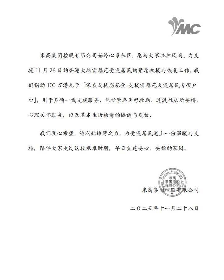 米高集團(tuán)控股有限公司始終心系社區(qū),愿與大家共擔(dān)風(fēng)雨。為支援11月26日的香港大埔宏福苑受災(zāi)居民的緊急救援與恢復(fù)工作,我們捐助100 萬港元予「保良局扶弱基金-支援宏福苑火災(zāi)居民專項戶口」,用于多項一線支援服務(wù),包括緊急醫(yī)療救助、過渡性居所安...