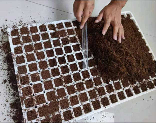 裝填基質(zhì)不超出盤面,不能壓緊、壓實(shí),苗穴邊框要清楚可見,用手或平直木板刮去盤面多余的基質(zhì)。